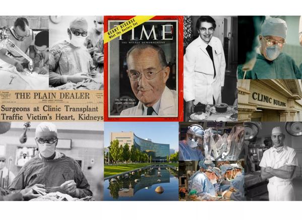 Clockwise from top left: Mason Sones, M.D.; Rene Favaloro, M.D .; Irvine Page, M.D.; Helen Brown, Ph.D.; Laurence Groves, M.D.; original Cleveland Clinic building; Toby Cosgrove, M.D.; Tom Mihaljevic, M.D., (top); Lars Svensson, M.D. (bottom); Heart & Vascular Institute; Donald Effler, M.D.