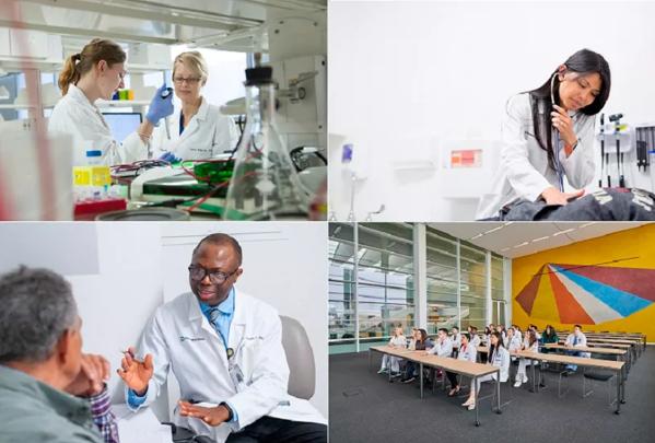 Clockwise from upper left: Lynn Bekris, Ph.D., Pauline Funchain, M.D., students in the new Health Education Campus, and Uche Iheme, M.D.