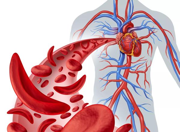 Sickle cell disease is an inherited blood disorder that leads to the production of abnormal hemoglobin, which is a red protein responsible for transporting oxygen in the blood. Normal red blood cells are round and can move through small blood vessels to deliver oxygen. However, in people with sickle cell disease, the genetic change in DNA causes a chemical alteration in hemoglobin and alters the shape of red blood cells into a sickle, blocking them from passing through narrow blood vessels. They can clog or break apart which also leads to decreased red blood cell life, and increased iron storage in the liver and heart. This can cause conditions such as liver fibrosis, liver failure, stroke, cardiomyopathy and heart failure along with severe pain.