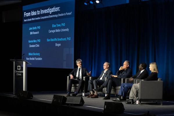Panelists discuss computational biotechnology as part of the Cleveland Discovery & Innovation Forum. From left: moderator, Dr. John Smith, IBM Research; Dr. Kenneth Merz, Cleveland Clinic; Mikkel Skovborg, Novo Nordisk Foundation; Dr. Elias Towe, Carnegie Mellon University; Dr. Sian Ratcliffe Smethurst, Biogen.